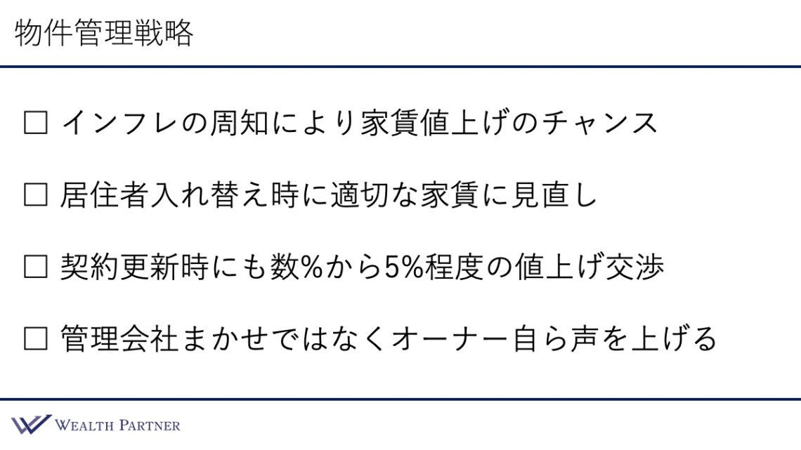 ですので、その家賃の値上げに応じて、ご自身が保有されている物件においても家賃の値上げを交渉したり、提案したりすることをやっていく必要があるのかなと思います。