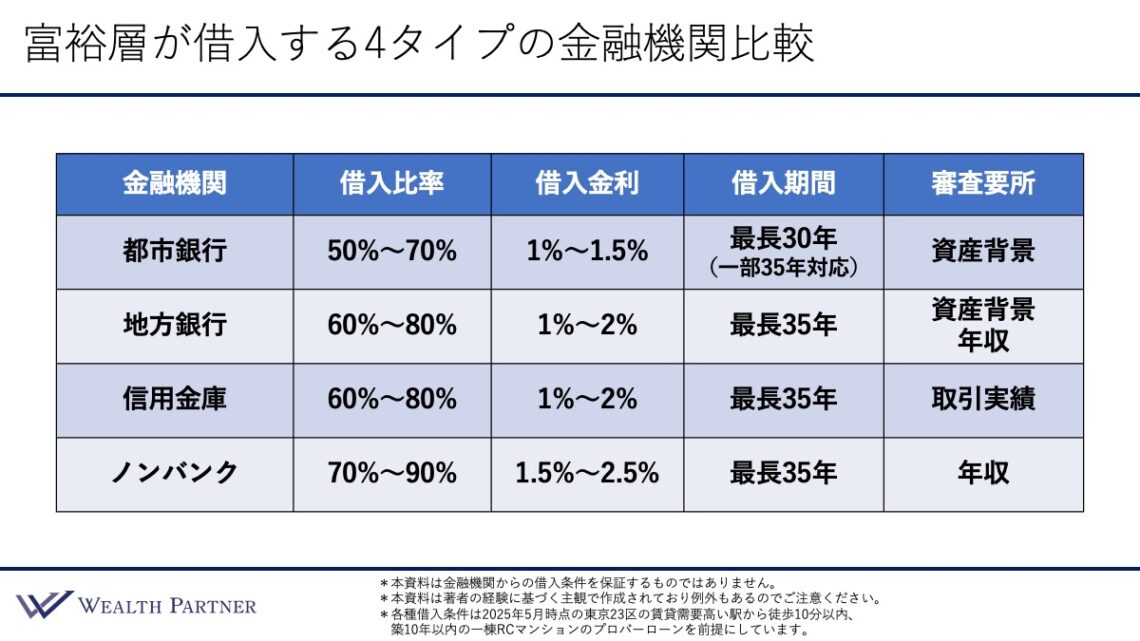 こちらの表は、富裕層が借入する4タイプの金融機関比較です。
