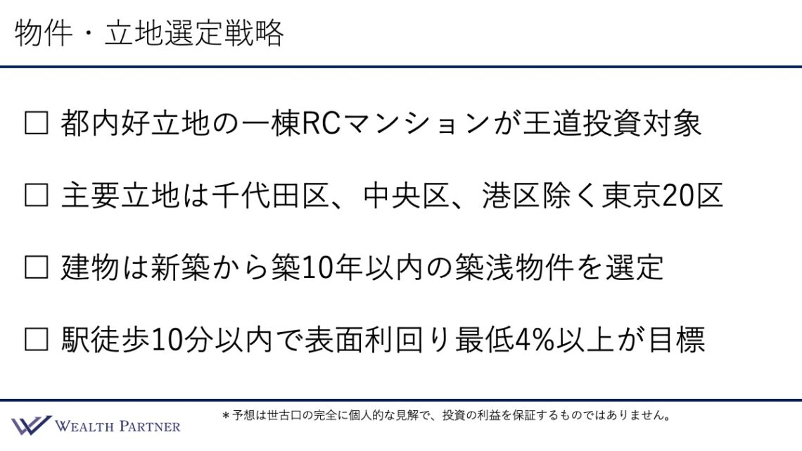 ここは出口戦略や物件管理に関する手間、修繕の手間、こういったところを考慮して新築から10年以内のいわゆる築浅物件、こういった物件が基本的な建物としてはいいのかなとは思っております。
