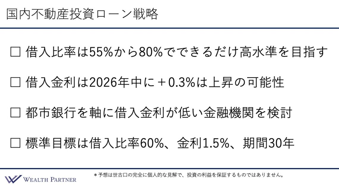 国内不動産投資ローン戦略ということで、不動産投資に伴う銀行借入に関する戦略になっています。