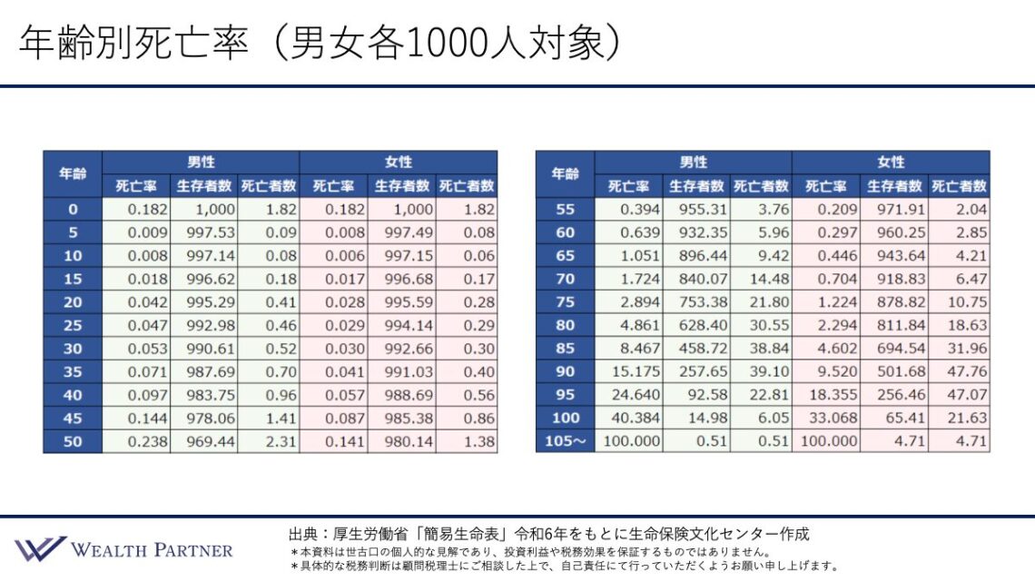 こちらは、男女各1,000人を対象とした年齢別死亡率の表です。男女それぞれ5歳刻みになっています。