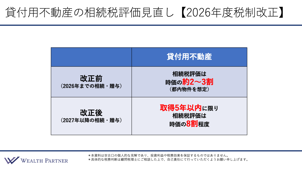 「こんなうまい話があるのか」と思われる方もいらっしゃるでしょう。しかし実際に、投資用不動産を保有するだけで、この程度相続税評価が下がっていました。これほど大幅に評価額を引き下げられることから、高齢の富裕層の方が相続対策として貸付用不動産を購入・保有されるケースが多く見られました。そこに明確な綱が張られたのが2026年度の税制改正です。