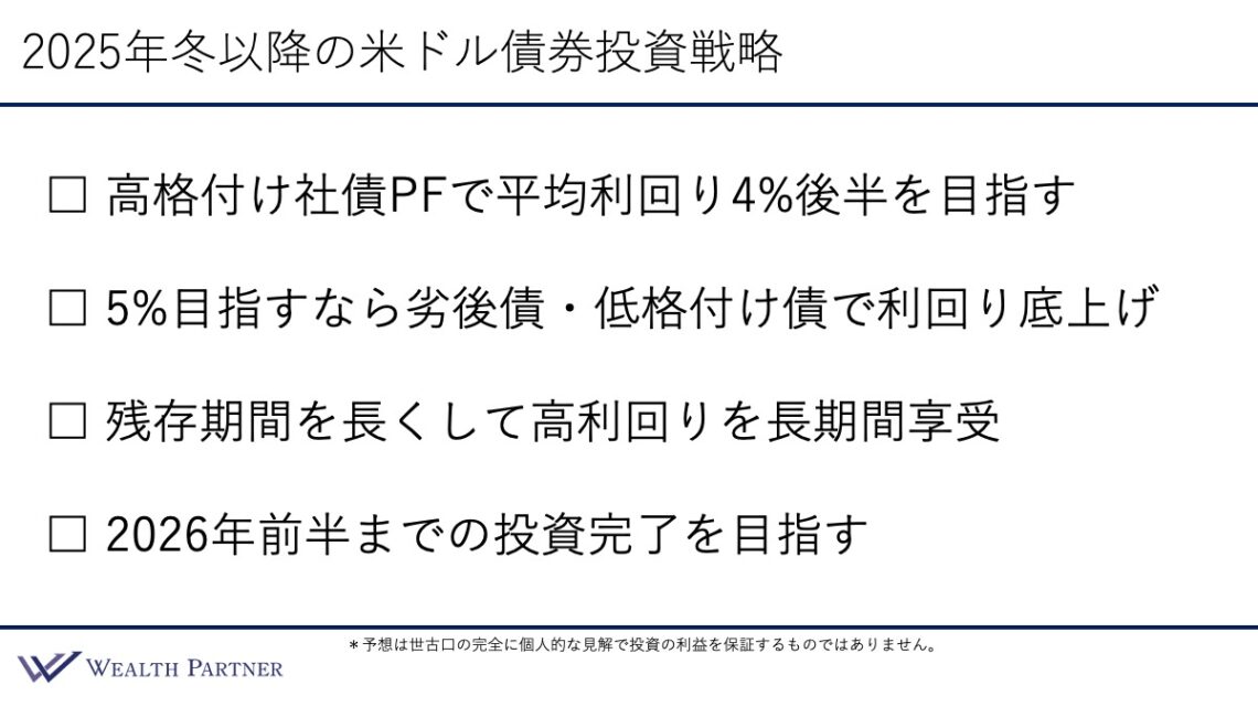 本日は「2025年冬以降の米ドル債券投資戦略」という内容でお届けさせていただきました。
