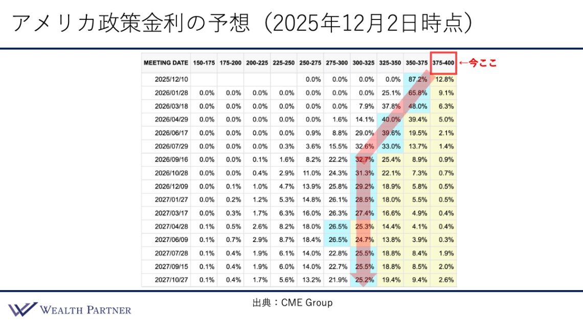こちらは2025年12月2日時点のアメリカ政策金利の予想です。先ほどご覧いただいた10年国債利回りは、この政策金利がベースとなっています。この政策金利は、アメリカの中央銀行(FRB)がミーティングデートごとに、何%にするのかを決めており、その市場予想が詳細に公開されています。直近の予想を確認していきましょう。