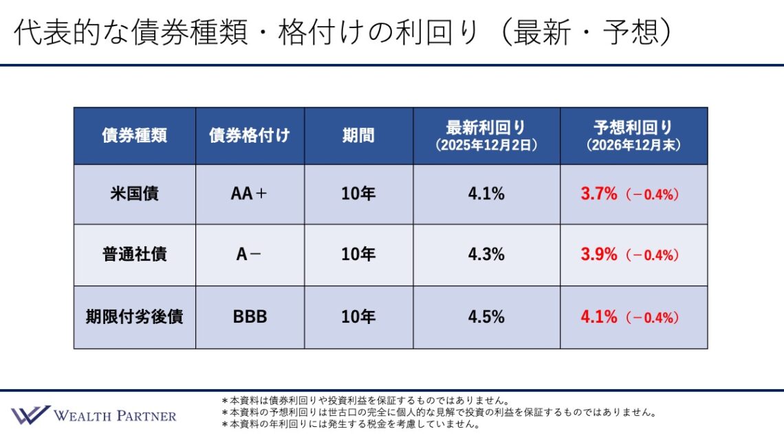 債券種類は3種類あり、米国債(債券格付けAA+、期間が10年)の最新の利回りは、現在(2025年12月2日)4.1%です。約1年後の2026年12月末には、おそらく0.4%ほど下がって3.7%になっている可能性が高いと私は予想します。