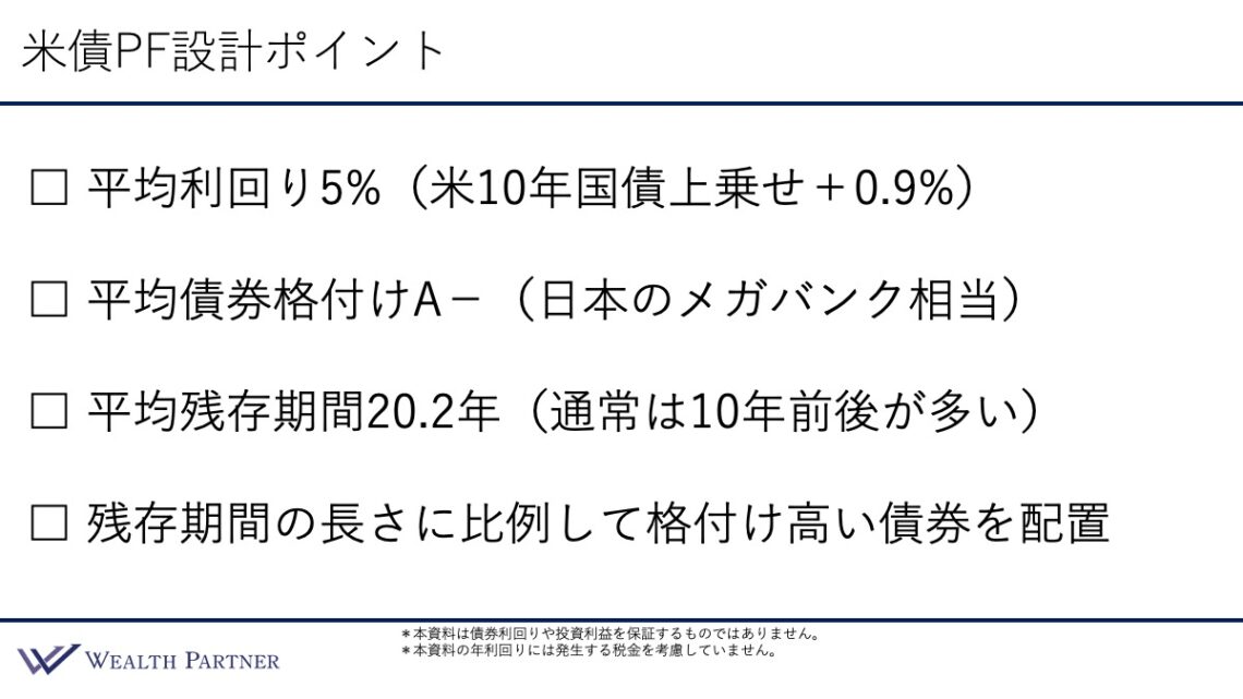 お伝えした米ドル債券ポートフォリオの最新設計例のポイントをまとめました。