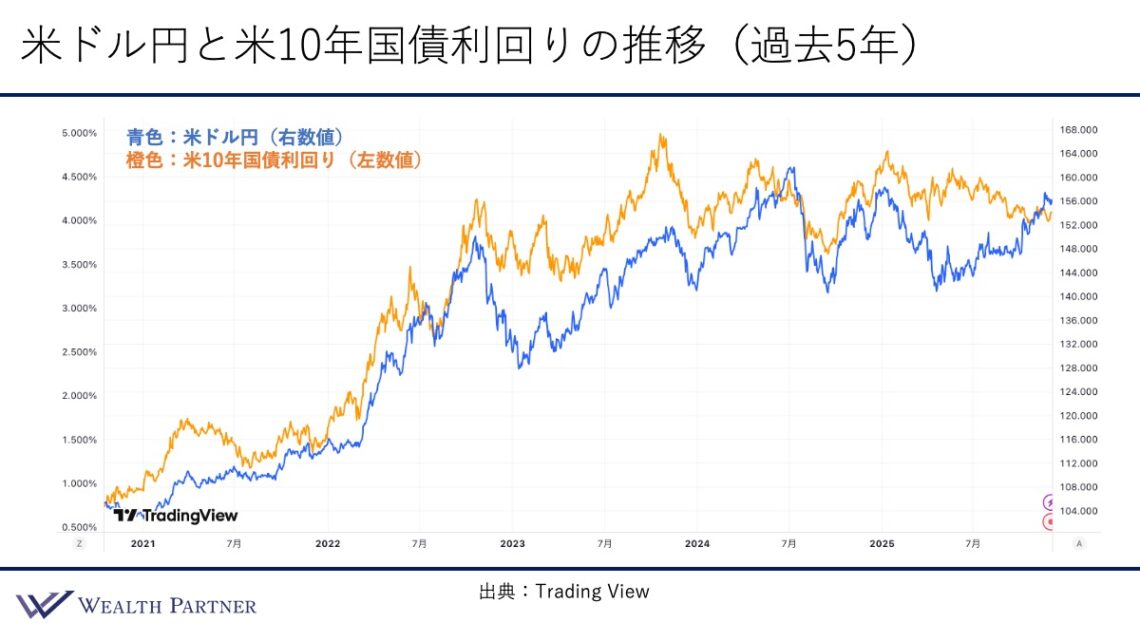 足元ではドル高円安に進む一方、利回りは低下傾向にあります。ただし為替は、複合的な要因によって動いています。日本では新しい総理大臣のもと、金利上昇が日本の財政負担になり、ドル高円安要因になっている側面もあります。複合的な要因が作用し、為替はやや複雑な状況になっていると見ています。