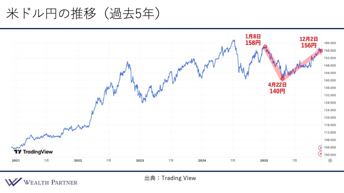 では、2025年の動きを見ていきましょう。年始は1ドル158円と、現在とほぼ同じ水準でした。そこから一旦ドル安円高に振れたのは、米国の政権に対する不安が意識されたためで、4月には一時140円までドル安円高に進みました。しかしその後、米国不安が徐々に解消し、日本では新総裁が財政に積極的で、財政緩和的な政策スタンスを示したこともあり、再びドル高円安が進行している状況です。12月2日時点では1ドル156円と、年始の水準にほぼ戻っている状況です。