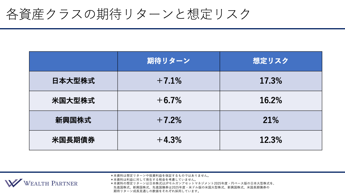 次に、JPモルガン・アセットマネジメントが公表している2025年版の期待リターンと想定リスクのデータを見ていきます。期待リターンとは過去データなどをもとに算出した年間リターンの目安、想定リスクとは期待リターンに対するぶれ幅(1標準偏差)を示す指標で、数値が高いほど振れ幅が大きくなります。上3段が株式、一番下が債券です。