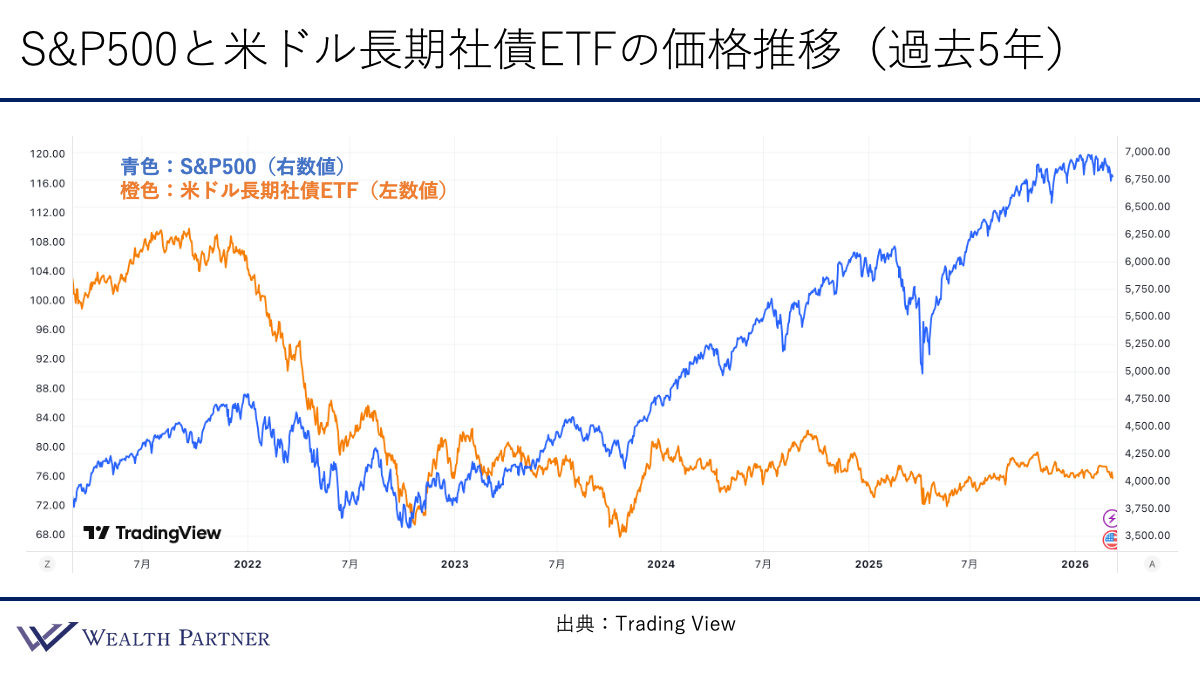 取り上げるのはS&P500(米国の平均株価指数)と、米ドル建て長期社債ETF(残存期間10年以上の債券で構成されるファンド)の過去5年間の価格推移です。こちらのチャートをご覧ください。青色がS&P500、オレンジ色が米ドル長期社債ETFを示しています。