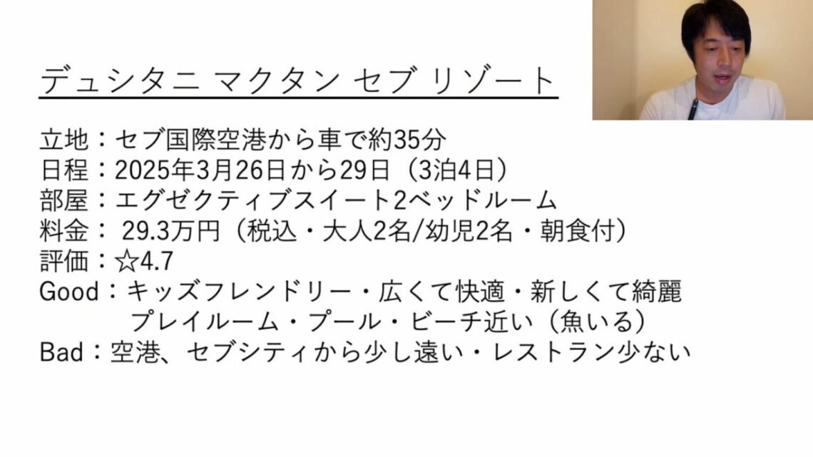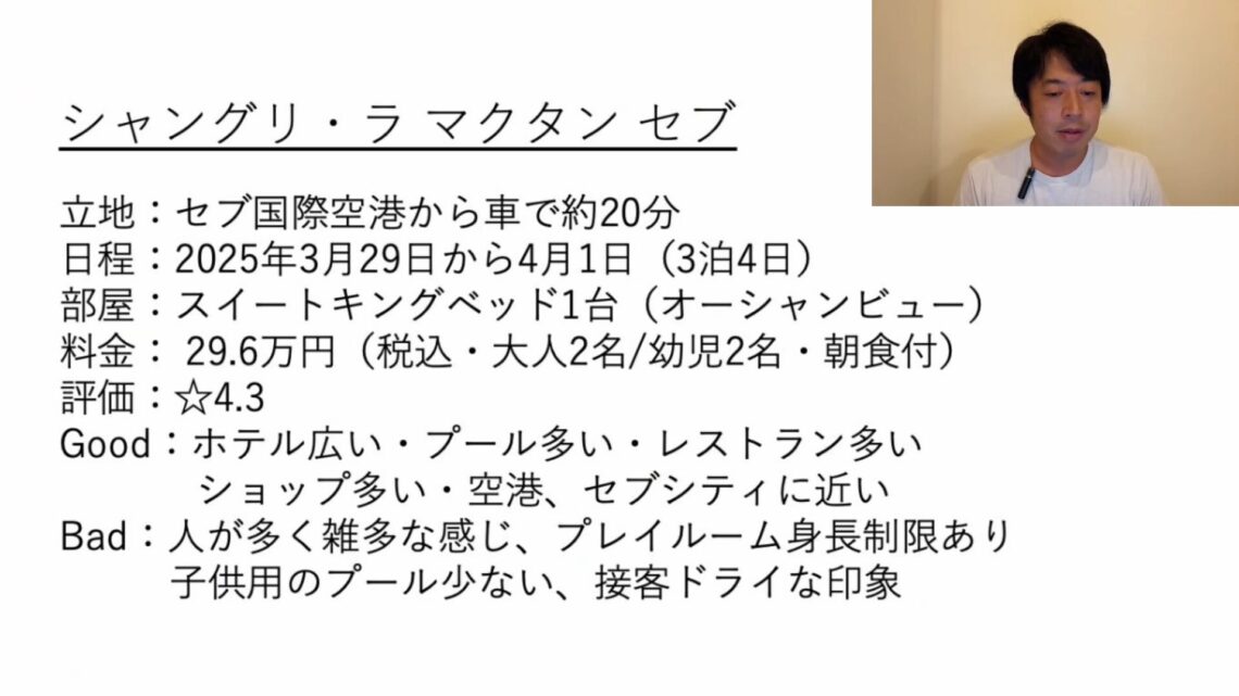 「フィリピン・セブ島の2大ホテル『シャングリラ』『デュシタニ』を比較紹介」という内容でお話しします。