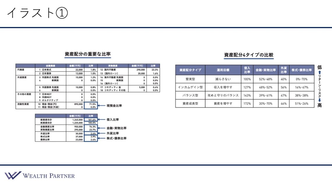 左側は資産配分の重要な比率です。現預金や借入比率、金融実物比率、外貨比率など、いつもお話ししている比率の説明になっています。この比率をこういう方であればこうした方がいいと、分かりやすい基準を持って合理的に説明しています。