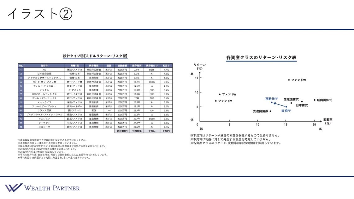 いろいろな債券ポートフォリオがあるのですが、富裕層の方がよく取られる設計タイプの債券ポートフォリオであるミドルリターン・リスク型です。利回りとリスクのバランスが一番取れたポートフォリオになります。