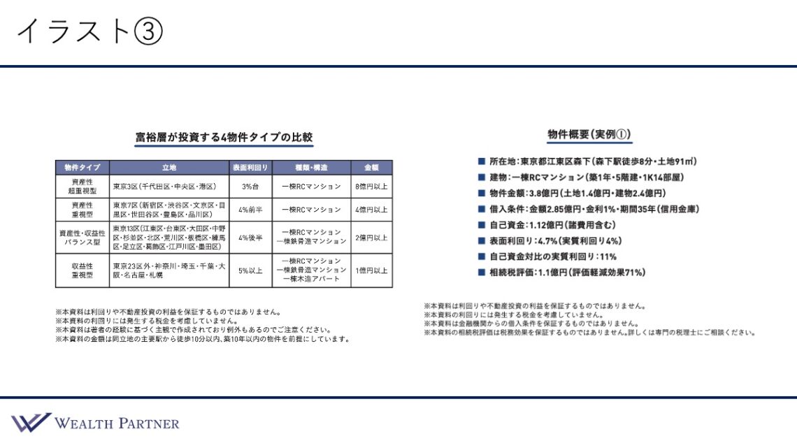 イラストの左側は富裕層が投資する4物件タイプの比較になっています。