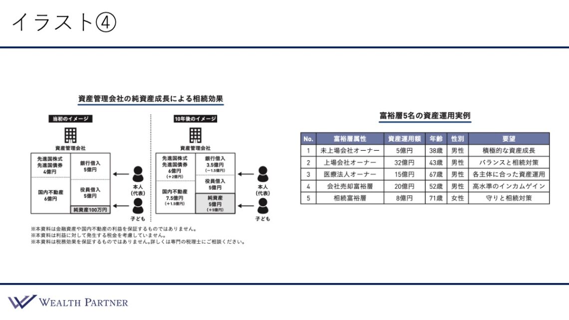 富裕層5名の方の資産運用実例のイラストになっています。属性がバラバラの富裕層の方(未上場会社オーナー、上場会社オーナー、医療法人オーナーなど)で、資産運用額も全然違っています。年齢や性別、考えている要望なども全然違っている実例です。